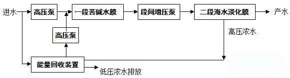 但使用海水淡化膜由于運(yùn)行壓力很高(達(dá)5MPa以上),意味著更高的能耗,本項目由于在缺水地區(qū),而能源價格較低,可以考慮在反滲透裝置中第一段使用普通苦咸水膜,第二段中使用海水淡化膜,一二段之間使用增壓泵進(jìn)行增泵,濃水排放出口設(shè)置能量回收裝置以降低能耗。具體設(shè)置見下圖: