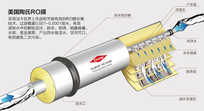 采用RO反滲透膜的濾芯。反滲透技術(shù):反滲透原文是REVERSE OSMOSIS,它是美國太空總署集合多國科學家, 在政府支持下,花費數(shù)十億美元,經(jīng)過多年研究而成。 反滲透的原理是在原水一方施加比自然滲透壓力更大的壓力,使水分子由濃度高的一方逆滲透到濃度低的一方 。由于反滲透膜的孔徑遠遠小于病例毒和細菌的幾百倍乃至上千倍以上,故各種病毒,細菌, 重金屬,固體可溶物,污染有機物,鈣鎂離子等根本無法通過反滲透膜,從而達到水質(zhì)軟化凈化的目的。