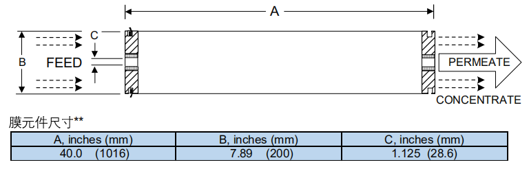 ESPAB MAX 膜元件膜面積為 440 ft2 (40.9 m2),采用同樣水通量設(shè)計(jì)時(shí)可節(jié)省約10%膜數(shù)量。ESPAB MAX一般用于第二級(jí)RO系統(tǒng)。
